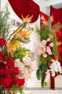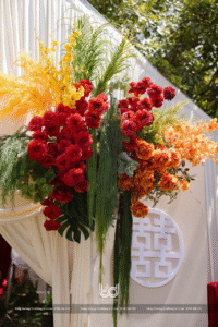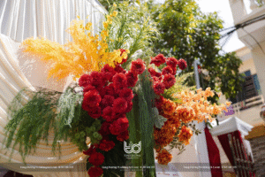 Những bó hoa hồng đỏ thắm, cành lan vàng óng ánh, ánh sáng vàng ấm len lỏi giữa dải lụa trắng mềm mại — tất cả hòa quyện để mang đến một khung cảnh đầy mê hoặc và tinh tế, khiến ai đặt chân đến cũng cảm nhận được hơi thở của hạnh phúc.