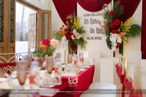 Sắc đỏ tượng trưng cho tình yêu sâu sắc và niềm hạnh phúc viên mãn, kết hợp cùng ánh vàng kim và tông kem nhẹ nhàng tạo nên tổng thể vừa sang trọng – cổ điển, vừa ấm áp – hiện đại.