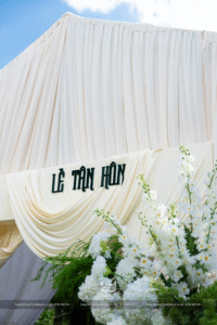 Phông nền lễ cưới được tạo điểm nhấn bằng họa tiết lụa trắng drap mềm mại, kết hợp cùng hoa tươi tạo chiều sâu cho không gian. Mỗi khung ảnh, từng chiếc ly pha lê hay tấm bảng tên đều được sắp xếp hoàn hảo để khi ánh sáng chiếu vào, mọi thứ trở nên lung linh như trong một thước phim lãng mạn.