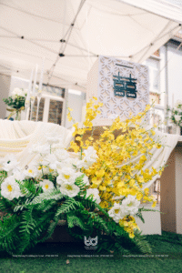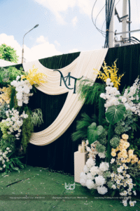 Không chỉ là màu sắc, mà mỗi chi tiết đều được chăm chút kỹ lưỡng — từ cách sắp đặt hoa tươi, rèm phủ, đến ánh sáng dịu nhẹ bao quanh không gian, tất cả đều nhằm tạo nên một khung cảnh hoàn hảo cho buổi lễ đính hôn của cặp đôi.