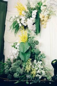 Ngay từ cổng chào, khách mời đã có thể cảm nhận được sự tinh tế và đẳng cấp trong từng đường nét trang trí. Hoa lan, cúc mẫu đơn, hồng kem được phối hài hòa, xen kẽ cùng tông màu trắng và xanh pastel, giúp không gian trở nên dịu mắt, hiện đại mà không kém phần ấm cúng.