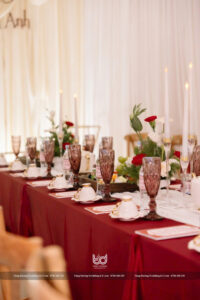 – Đỏ Burgundy (rượu vang): Sang trọng, tinh tế, lý tưởng cho tiệc cưới buổi tối tại khách sạn hoặc biệt thự.