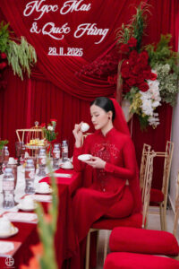 Mẹo nhỏ: Ưu tiên chất liệu cao cấp như satin, nhung, ren; hạn chế họa tiết rườm rà; và điểm nhấn son đỏ sẽ giúp cô dâu tỏa sáng tự nhiên.